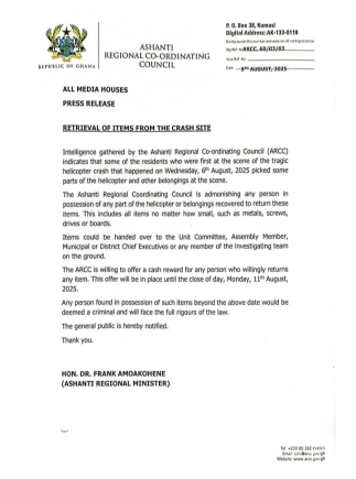 The Ashanti Regional Co-ordinating Council (ARCC) has issued an appeal to residents in the Adansi area to return any items retrieved from the site of Wednesday’s fatal military helicopter crash, which claimed the lives of eight individuals, including two government ministers.