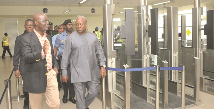 President Mahama inspecting an expansion work at the arrival hall. With him are Mr Fifi Kwetey (left), the Minister of Transport, and Mr Tony Lithur