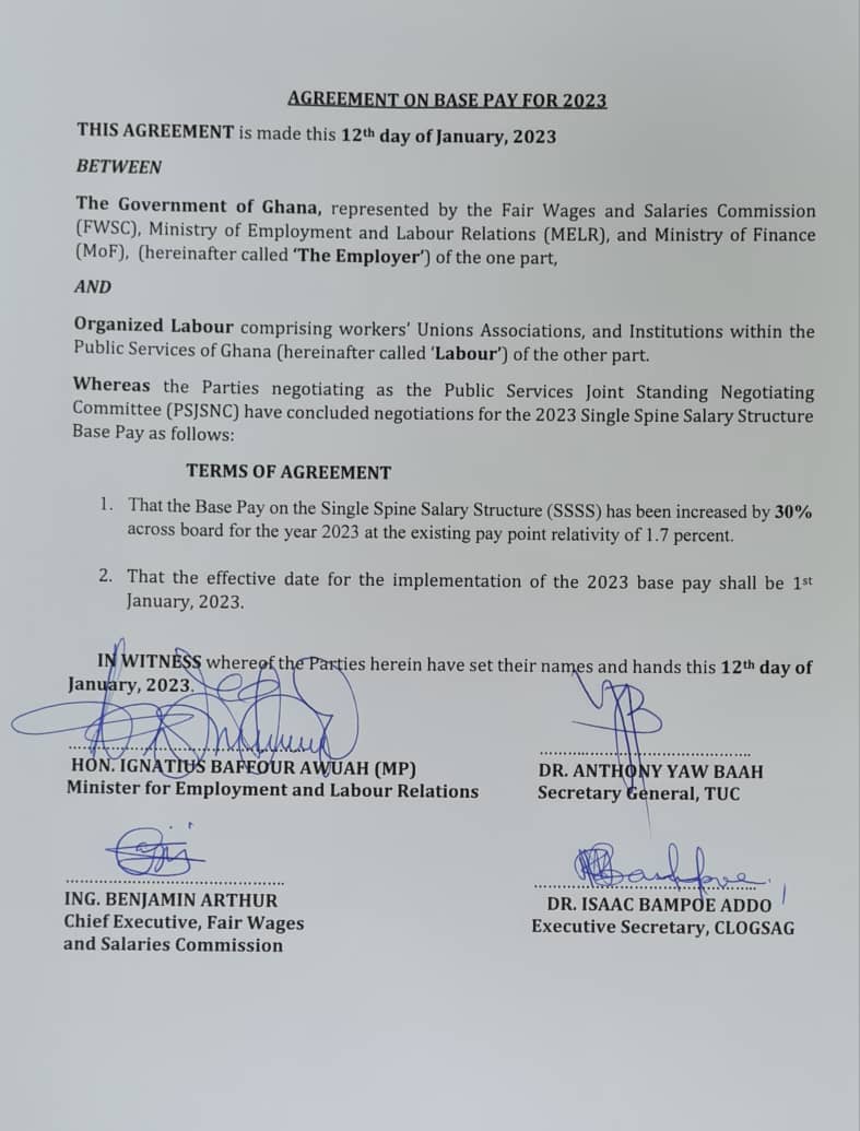Attached below is the signed agreement between the government represented by the Fair Wages and Salaries Commission (FWSC), the Ministry of Employment and Labour Relations (MELR) and Ministry of Finance and Organised Labour comprising workers' unions associations and institutions within the Public Services of Ghana.