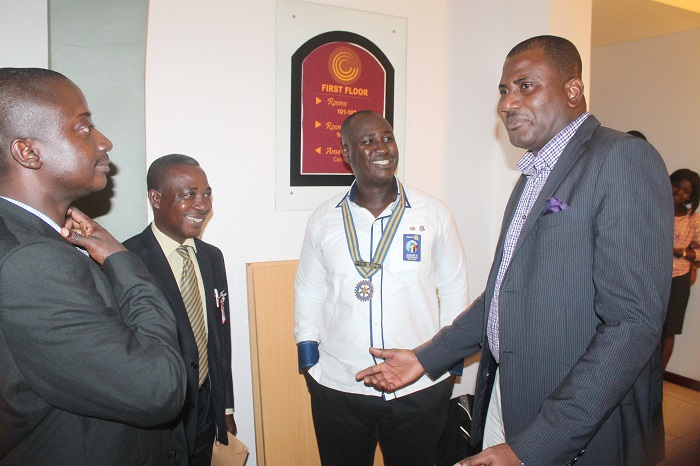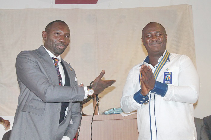 Mr Lamptig Apanga (left), Immediate Past President of Rotary Club Accra Labone introducing Mr George Agyekum (right), as the new President of Rotary Club Accra Labone after the ceremony in Accra