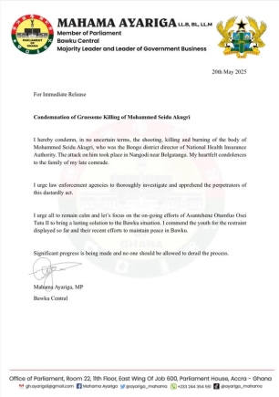 In a statement dated May 20, 2025, Mr Ayariga expressed his dismay, declaring, “I hereby condemn, in no uncertain terms, the shooting, killing and burning of the body of Mohammed Seidu Akugri, who was the Bongo District Director of National Health Insurance Authority.