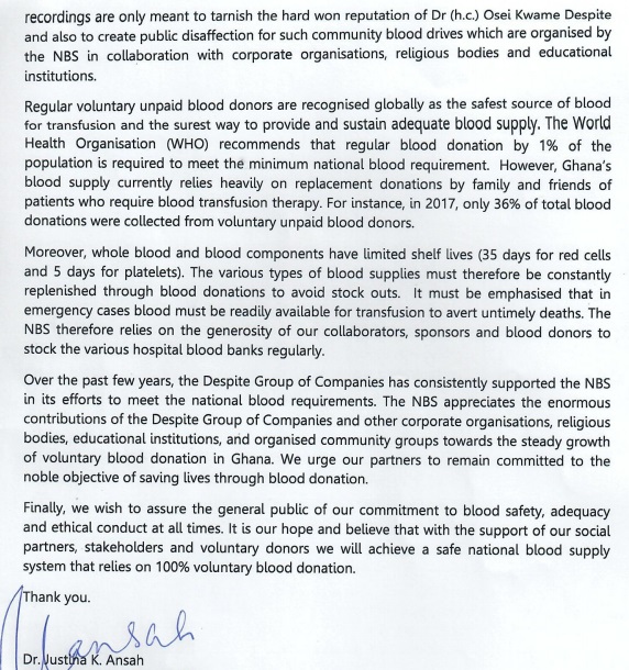 "We wish to state without equivocation that NO STAFF OF THE DESPITE GROUP OF COMPANIES was involved in the technical processes of the blood donation exercise (that is, registration; screening; blood collection; storage; and transportation of the donated blood during the recent ceremony community blood drive at the El-Wak Sports Stadium on 30th June 2018. The entire blood donation exercise was successfully managed by a joint team of dedicated health professionals drawn from the Southern Zonal Blood Centre, 37 Military Hospital, Police Hospital, and Cape Coast Teaching Hospital," the statement said.