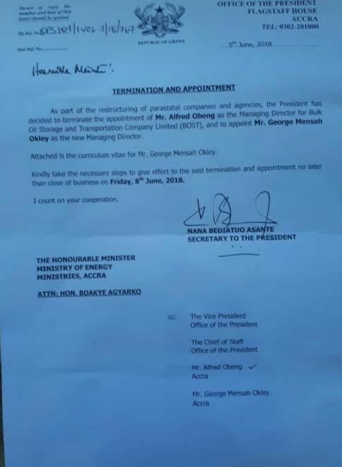The government has dismissed the Managing Director of the Bulk Oil Storage and Transport Company, Mr Alfred Obeng Boateng.