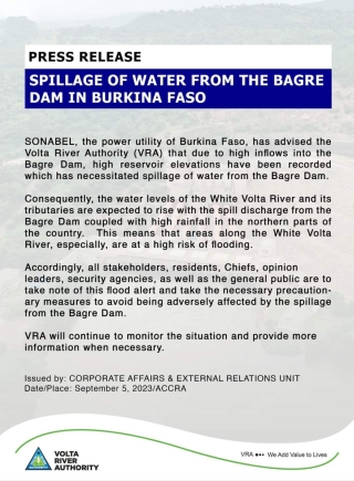 SONABEL, the power utility of Burkina Faso, has issued a critical alert to the Volta River Authority (VRA) regarding the ongoing spillage of water from the Bagre Dam.