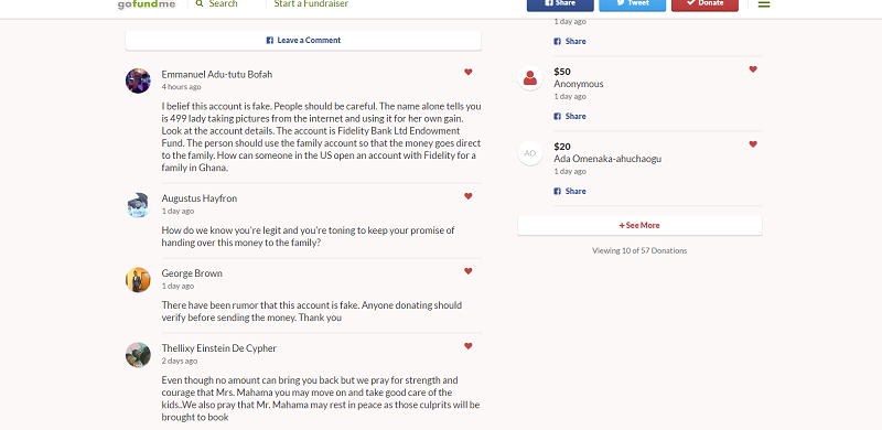 Another person by name Emmanuel Adu-tutu attacked the credibility of the campaign stating that "believe this account is fake. People should be careful. The name alone tells you is 499 lady taking pictures from the internet and using it for her own gain. Look at the account details. The account is Fidelity Bank Ltd Endowment Fund. The person should use the family account so that the money goes direct to the family. How can someone in the US open an account with Fidelity for a family in Ghana."