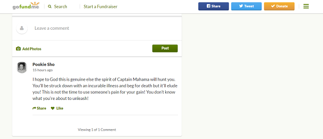 PookieSho, another user did not take it lightly with the fundraisers. "I hope to God this is genuine else the spirit of Captain Mahama will hunt you. ... This is not the time to use someone's pain for your gain! You don't know what you're about to unleash!"