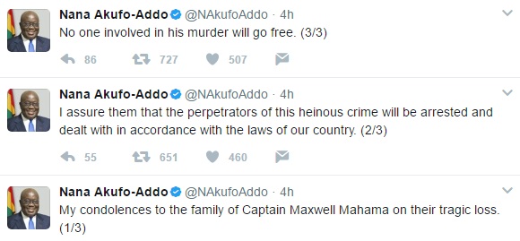He also extended his sympathies to the family of Captain Mahama: "My condolences to the family of Captain Maxwell Mahama on their tragic loss".