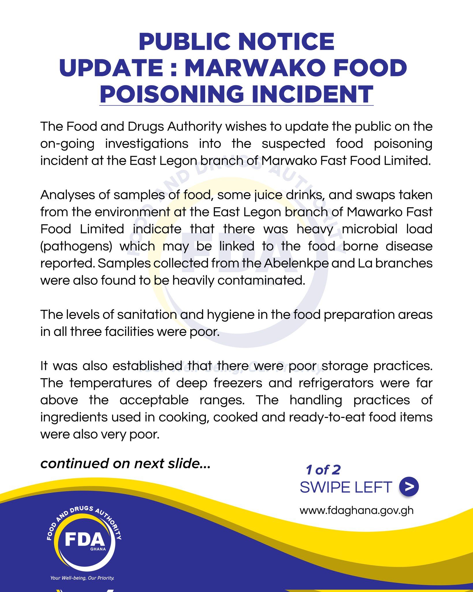 The Food and Drugs Authority wishes to update the public on the ongoing investigations into the suspected food poisoning incident at the East Legon branch of Marwako Fast Food Limited.