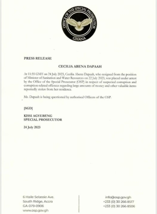 At 11:55 GMT on 24 July 2023, Cecilia Abena Dapaah, who resigned from the position of Minister of Sanitation and Water Resources on 22 July 2023, was placed under arrest by the Office of the Special Prosecutor (OSP) in respect of suspected corruption and corruption-related offences regarding large amounts of money and other valuable items reportedly stolen from her residence.