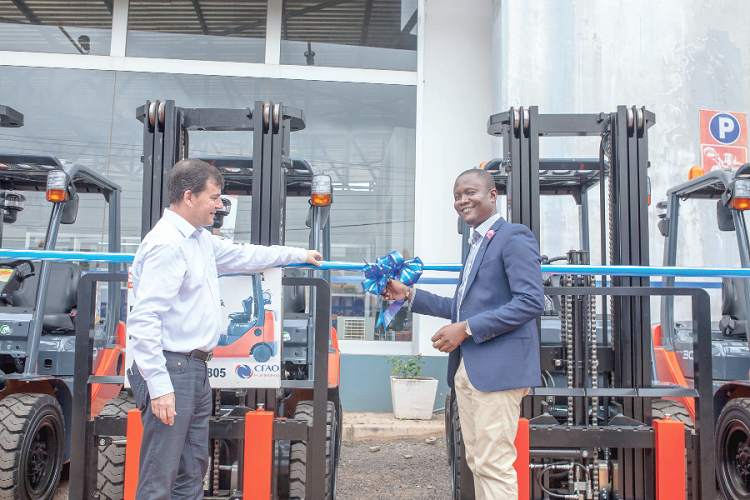 Mr. Michel Louis Olivier. MD of CFAO Equipment Ltd cutting the ribbon with Mr. Kweku Amankwah, MD. Third Party Logistics