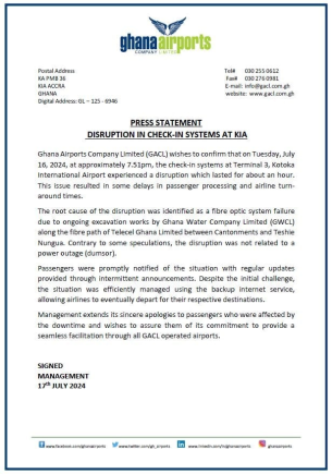 GACL clarified that this was not due to a power outage, but rather ongoing excavation works by the Ghana Water Company Limited (GWCL) along the fibre optic path between Cantonments and Teshie Nungua.