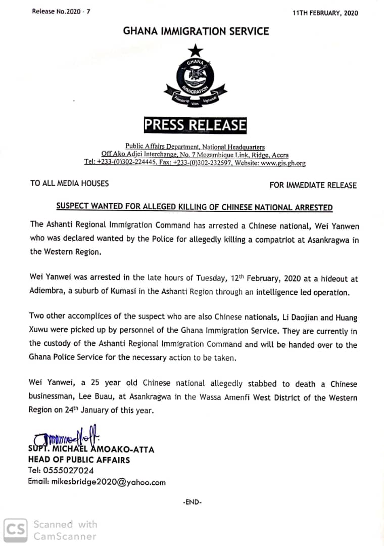 A Chinese national, Wei Yanwen, who was declared wanted by the Police for allegedly killing a compatriot at Asankragwa in the Western Region has been arrested by the Ashanti Regional Immigration Command.