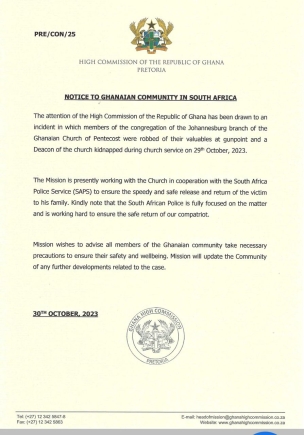 A notice dated October 30, 2023, issued to the Ghanaian community in South Africa by Ghana's High Commission in South Africa said the Commission was working with the police to ensure the "speedy and safe release and return of the victim to his family."