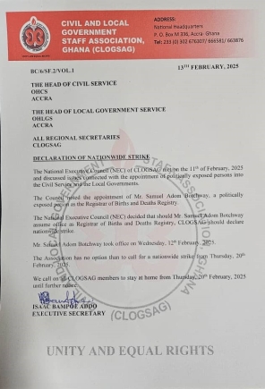 The Civil and Local Government Staff Association, Ghana (CLOGSAG), has announced a nationwide strike in response to Samuel Adom Botchway's appointment as the Registrar of the Births and Deaths Registry.