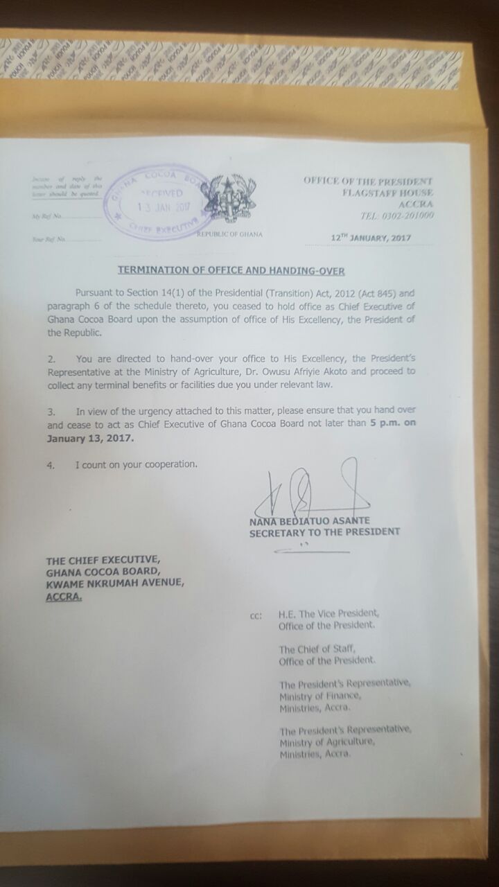 “Pursuant to section 14 (1) of the Presidential (Transition) Act 2012, (Act 845) and paragraph 6 of schedule thereto, you ceased to hold office as Chief Executive Officer of the Ghana Cocoa Board upon assumption of office of his Excellency the president of the Republic,” the letter read.