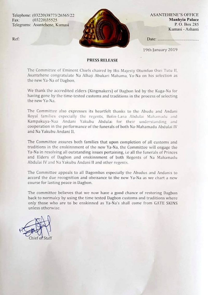 The Eminent Chiefs in a statement issued January 19 expressed gratitude to the Abudu and Andani Royal families for their understanding and cooperation in the performance of the funerals of both Na-Mahamudu Abdulai IV and Na Yakubu Andani II.