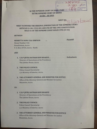 In the writ filed on Monday, June 23, 2025, Henrietta Nana Yaa Simpson is asking the Supreme Court to declare that the appointment of Kofi Boakye to the Police Council was unconstitutional, null and void, and to order his removal.