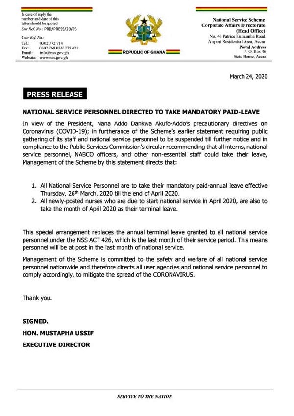 The National Service Secretariat (NSS) has directed all National Service Personnel to immediately take their mandatory paid leave as part of measures to help curb the communal spread of the Coronavirus disease (COVID-19) in Ghana.