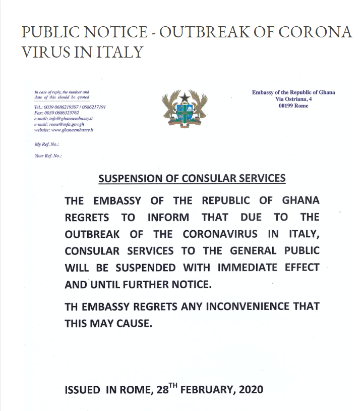 “The Embassy of the Republic of Ghana regrets to inform [you] that due to the outbreak of the coronavirus in Italy, consular services to the general public will be suspended with immediate effect and until further notice. The embassy regrets any inconvenience that this may cause,” the statement said.