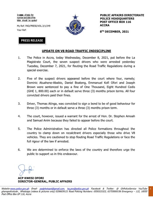 A Police statement signed by the Director-General, Public Affairs, ACP Kwesi Ofori said of the seven, only Dr Amoah and another driver Samuel failed to appear before the court today.