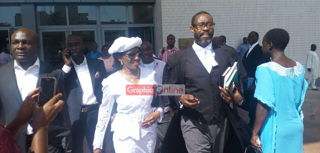 Nana Konadu Agyeman-Rawlings and her Lawyer Mr Ace Ankomah leaving the court premises on Tuesday.