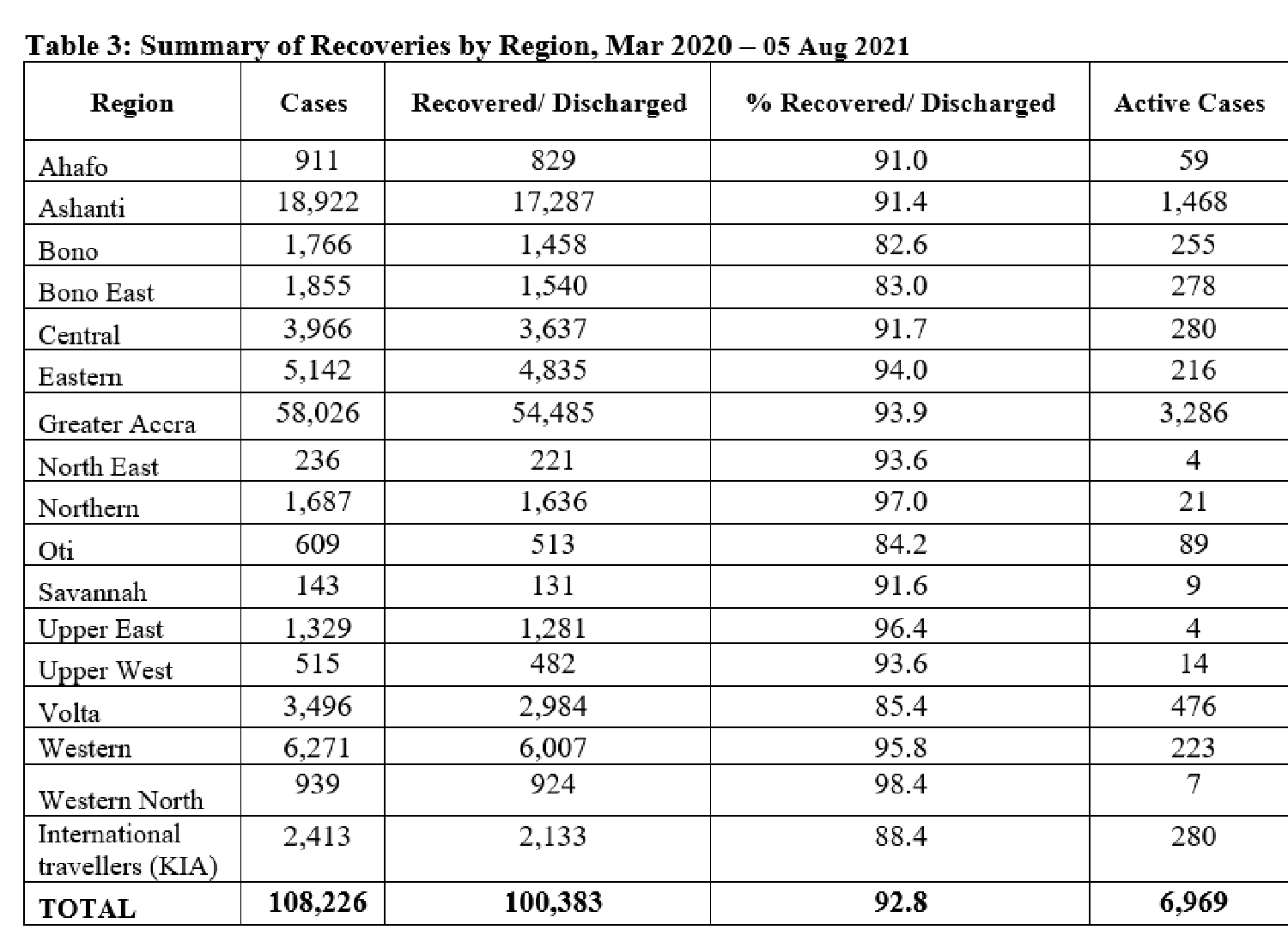 The Greater Accra Region still leads with the highest number of active cases with 3,286 infections, followed by the Ashanti Region with 1,468 infections, then the Volta Region with 476, and the international travellers (KIA) with 280 infections.