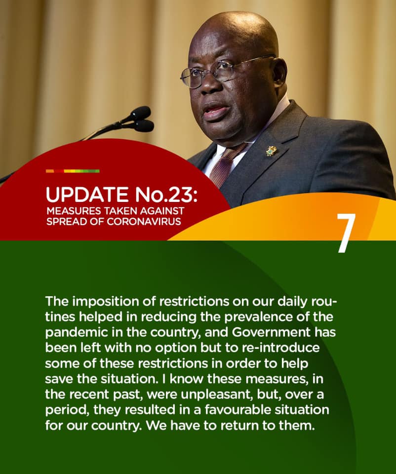 President Akufo-Addo stressed that the imposition of restrictions on daily routines in 2020 helped in reducing the prevalence of the pandemic in Ghana, and therefore the government has been left with no option to re-introduce some of "these restrictions in order to help save the situation."