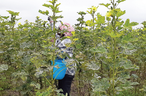 A farmer harvesting okro