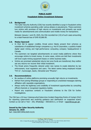 The Cyber Security Authority (CSA) has issued a public alert following a surge in fraudulent online investment schemes, which have led to financial losses totalling GH¢65,860 within the first 29 days of 2025.