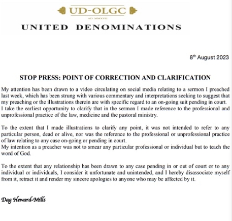 In his statement dated August 8, 2023, Heward-Mills asserted, "My intention as a preacher was not to smear any particular professional or individual but to teach the word of God. To the extent that any relationship has been drawn to any case pending in or out of court or to any individual or individuals, I consider it unfortunate and unintended, and I hereby disassociate myself from it, retract it and render my sincere apologies to anyone who may be affected by it."