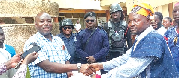 Anogiba Zakari Azure (right), one of the leaders of the demonstrators, presenting a petition to Moses Awarikaro Awenkanaab (left), the Bawku West District Engineer of the Works Department