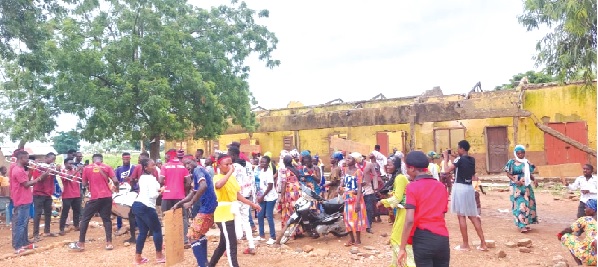 The concerned youth demonstrating around the damaged three-unit classroom block
