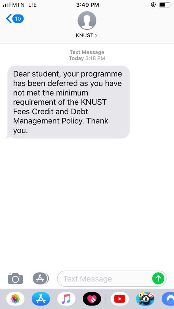 “Dear student, your programme has been deferred as you have not met the minimum requirement of the KNUST fees Credit and Debt Management Policy”, read the messages the university sent to the affected students.