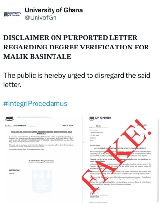 A letter dated June 2, 2025 issued by Dr Elizier Taiba Ameyaw-Buronyah, the Director of the Public Affairs Directorate of the University of Ghana indicated that a letter being circulated on social media, purportedly signed by the Registrar, Mrs. Emelia Agyei-Mensah and addressed to the Secretary of the Civil Service Council with the title "RE: REQUEST FOR VERIFICATION OF DEGREE - MALIK BASINTALE" and dated 27th May, 2025, was "a forgery and neither the Registrar nor any other officer of the University has received, processed or responded to any such request."