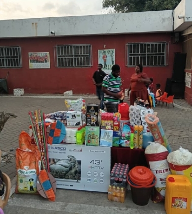 Additionally, the group presented a gallon of cooking oil, two bags of rice, packs of spaghetti, sardines, tinned tomatoes, Kivo pepper, gari, corn dough, soft drinks, and various assorted detergents.