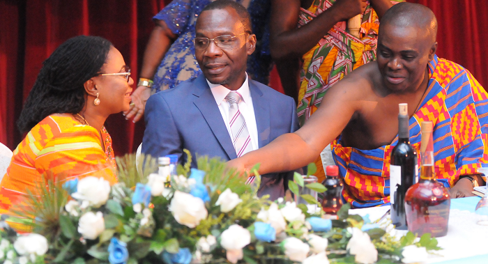 Mrs Charlotte Osei (left), Chairperson, Electoral Commission, welcoming Osagyefo Oseadeeyo Agyeman Badu II, the Dormaahene, to the awards ceremony. With them is Mr Affail Monney. Picture: EMMANUEL ASAMOAH ADDAI