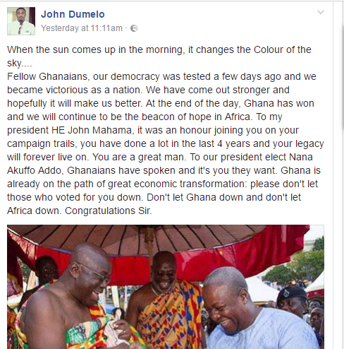 Dumelo, a supporter of the outgoing NDC administration yesterday in a post to his over 4.5million followers on social networking website, Facebook said Ghana has already been set on the path of "great economic transformation" and Akufo-addo must ensure that such gains are not lost.
