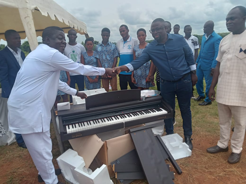 Headmaster of Nkenkaasu SHS, Kwaku Djan-Asante (Left) receiving a digital piano from CTVET boss, Dr. Fred Kyei Asamoah (Right) during the school's SRC Week Celebration. Dr. Asamoah also donated GH¢15,000 for banded wristbands, t-shirts, pens for the school.