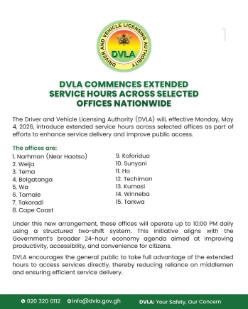 Under the new arrangement, which takes effect from Monday, May 4, 2026, a total of 15 DVLA offices will operate until 10:00 pm each day through a structured two-shift system. The initiative is expected to provide greater flexibility for motorists and clients who are unable to access services during regular working hours.