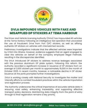 The Driver and Vehicle Licensing Authority (DVLA) has impounded 40 vehicles at the Tema Harbour following an intelligence-led operation that uncovered the use of fraudulent Drive from Port (DP) stickers, as well as genuine stickers affixed to vehicles with mismatched records.
