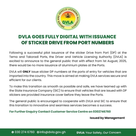 The Driver and Vehicle Licensing Authority (DVLA) has announced that, effective August 1, 2025, it will cease issuing vehicle aluminium number plates at Ghana’s ports of entry, replacing them with a fully digital sticker-based system known as the Drive from Port (DP) number.