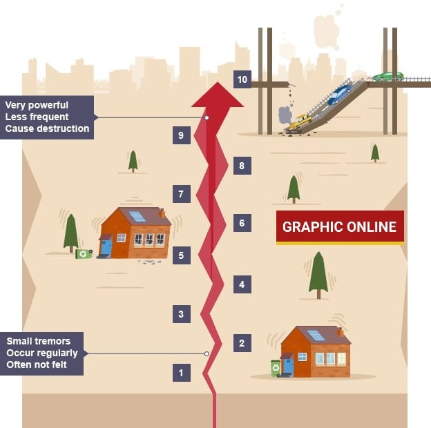 Earthquakes measuring 1-2 on the scale happen regularly, and they are so small that people cannot feel them. Earthquakes measuring upwards of 7 are less frequent but very powerful, and can cause a lot of destruction.