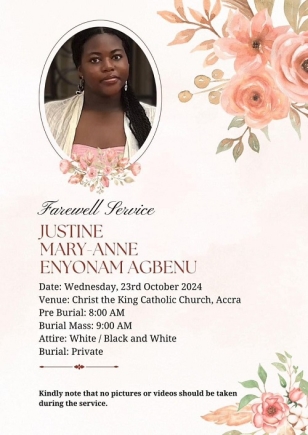 Justine Agbenu, one of the victims of the tragic East Legon accident, has been laid to rest after a burial service at the Christ the King Catholic Church in Accra on Wednesday.