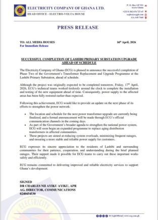 Following the completion of the Lashibi works, ECG indicated that preparations are underway for the next phase of transformer upgrades across the network. The Authority said the location and schedule for the next intervention are currently being finalised and will be communicated through its official channels in the coming days.