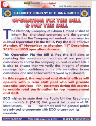 “ECG wishes to state that the Public Utilities Regulatory Commission’s LI (2413) gives us full access to all our installations, therefore customers and the general public are being advised to cooperate with ECG to carry out our mandate." it added.