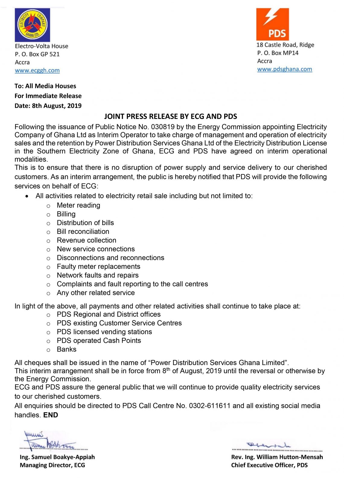 A statement jointly signed by the Managing Director of ECG, Ing. Samuel Boakye-Appiah and the Chief Executive Officer of PDS, Rev. Ing William Hutton-Mensah said PDS will be responsible for meter reading, billing, distribution of bills, bill reconciliation, revenue collection, and new service connections.