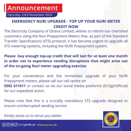 “For your convenience and the immediate upgrade of your Nuri Prepayment meters, please call our call centre on 0302 611611 or contact us via our social media platforms (ECGghOfficial) for expedited action,” the statement said.