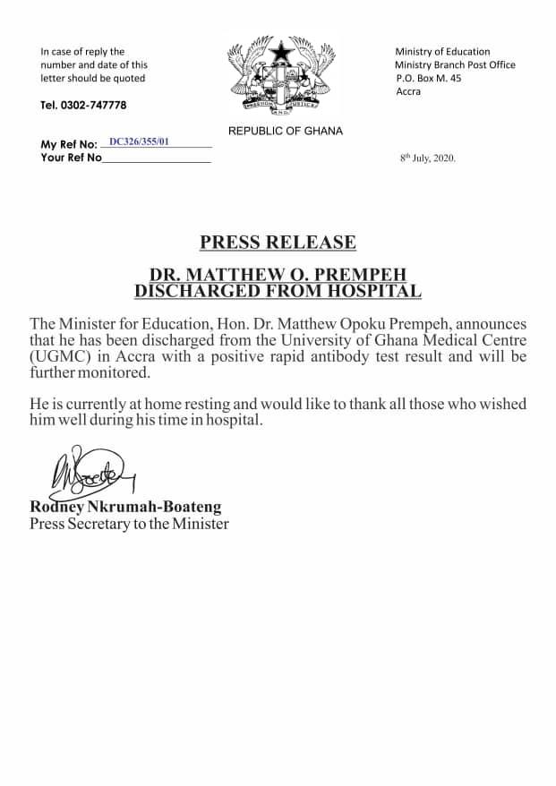 The Minister of Education, Dr Matthew Opoku Prempeh, who tested positive for the coronavirus disease (COVID-19) has been discharged from hospital. He is yet to test negative though.