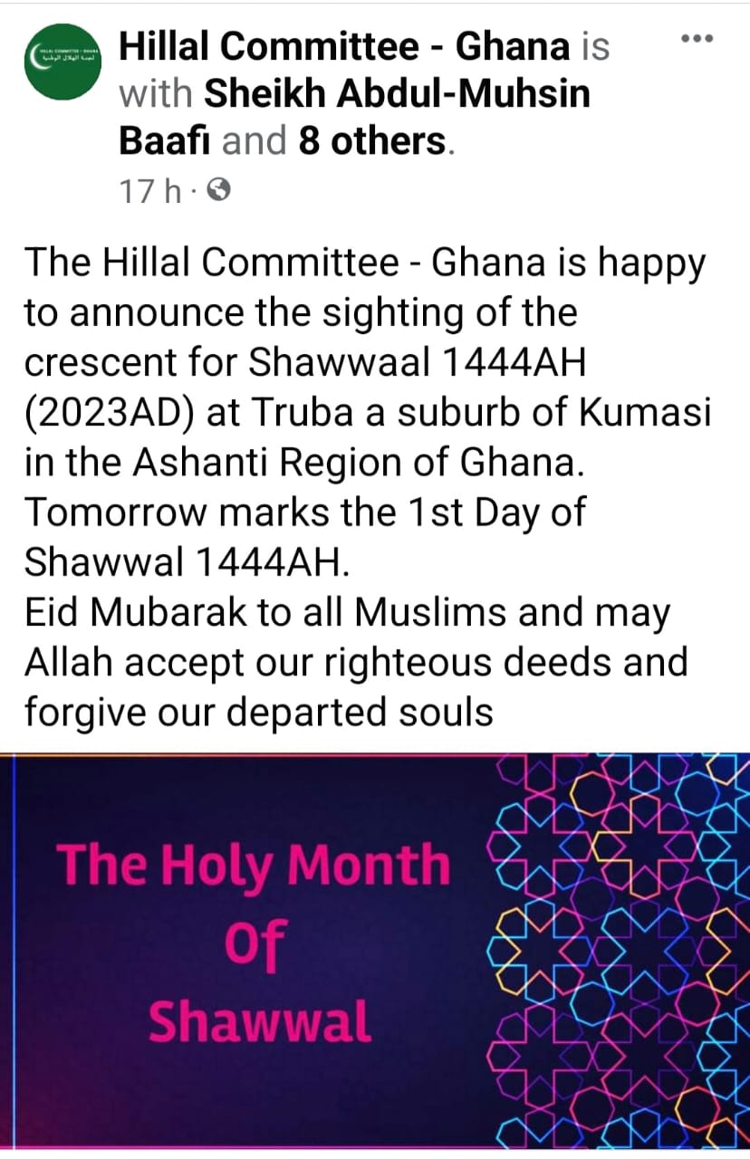 The Hillal Committee - Ghana, the body responsible for coordinating the moon sighting in Ghana, confirmed the sighting, which means there will be no fast observed on Friday, April 21, 2023.