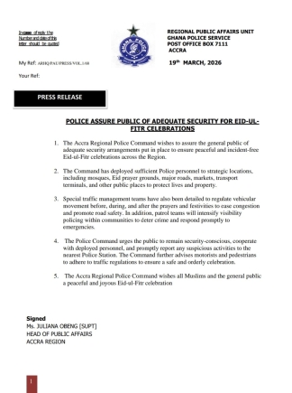 The Accra Regional Police Command has announced the deployment of sufficient personnel to ensure security during the Eid-ul-Fitr celebration across the region.